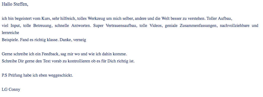 Ich finde den Kurs wirklich gut gemacht. Ist einfach mal was Neues und du erklärst alles sehr gut. Ich habe auf der Arbeit, Zuhause und sogar im Park gelernt. Das Beste ist, dass ich mich persönlich weiterentwickelt habe. Mit den TA-Modellen arbeite ich inzwischen täglich an mir. Ich kann mich jetzt besser reflektieren und zielführender Gespräche führen. Hilft mir wirklich weiter. Ebenso macht sich das Zertifikat gut in meinem Lebenslauf.