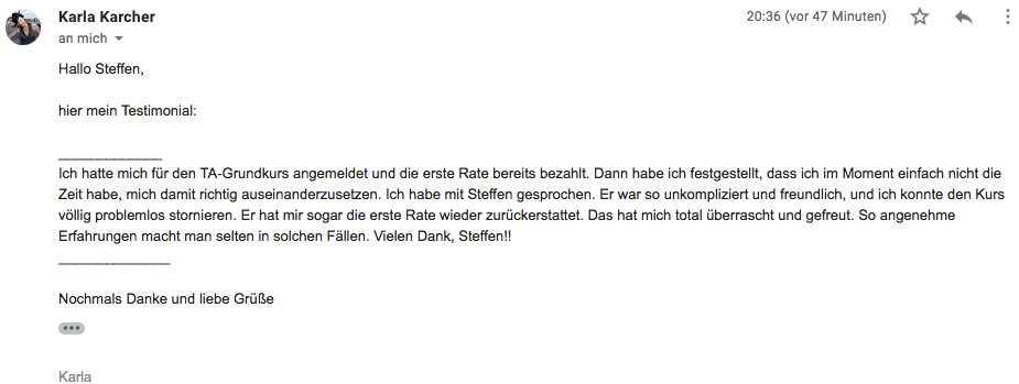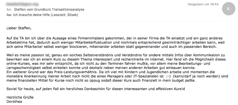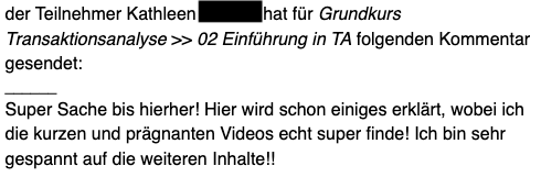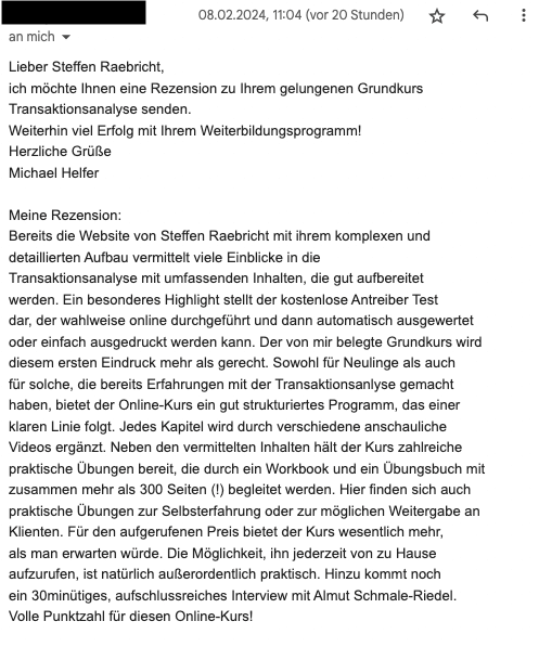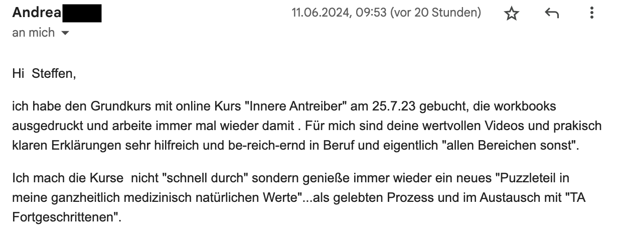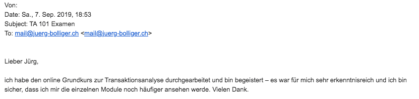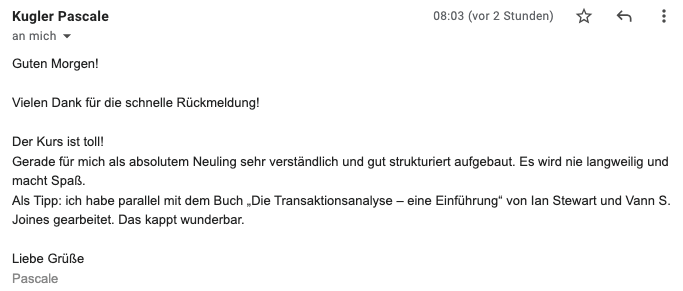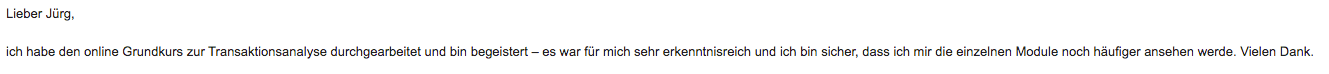 mir hat euer TA-101 Onlinekurs sehr gut gefallen. Augrund der Möglichkeit der flexiblen Zeiteinteilung habe ich beschlossen, diesen Onlinekurs zu belegen. Darüber hinaus ist der finanzielle Aufwand - im Gegensatz zu Präsenzkursen gering. Meines Erachtens ist der Onlinekurs sehr gut strukturiert und beinhaltet alle Themen, die zu einem Einführungskurs gehören. Obwohl ich mich schon etwas länger mit der TA beschäftige, gab es einige Aspekte, die ich dazugelernt habe und mit denen ich mich auch in Zukunft noch näher beschäftigen werde. Sehr gut gefallen hat mir auch das zusätzliche Material, mit dem ich mich selbst besser kennen lernen konnte, und das dafür sorgte, die angeführten Themen in den Videos zu vertiefen.