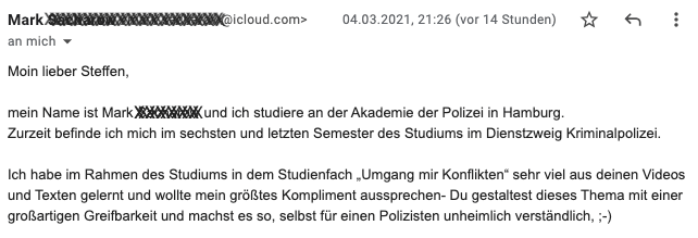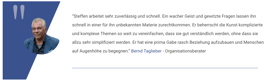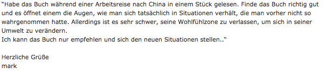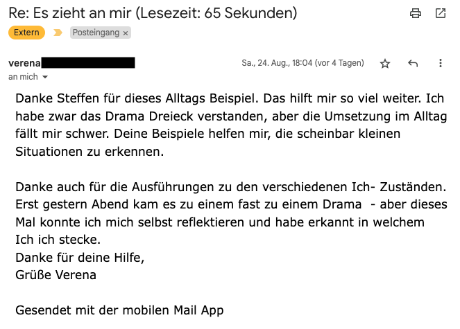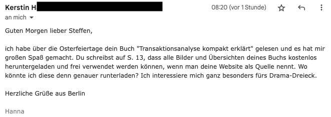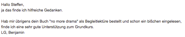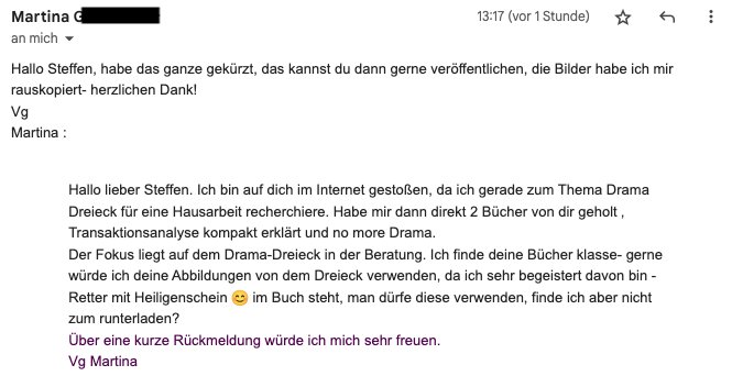 Hi Steffen, habe es am Wochenende geschafft dein Buch komplett durchzulesen und finde es wirklich sehr gelungen. Das Thema ist sehr spannend und das "Drama-Dreieck" ein durchaus simples Werkzeug mit dem auch ich als Nicht-Psychologe umgehen kann. Ich möchte dir hiermit virtuell auf die Schulter klopfen. Mit dem Buch hast du einen tollen Job gemacht ;-) LG, Jonathan