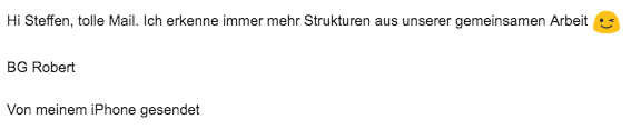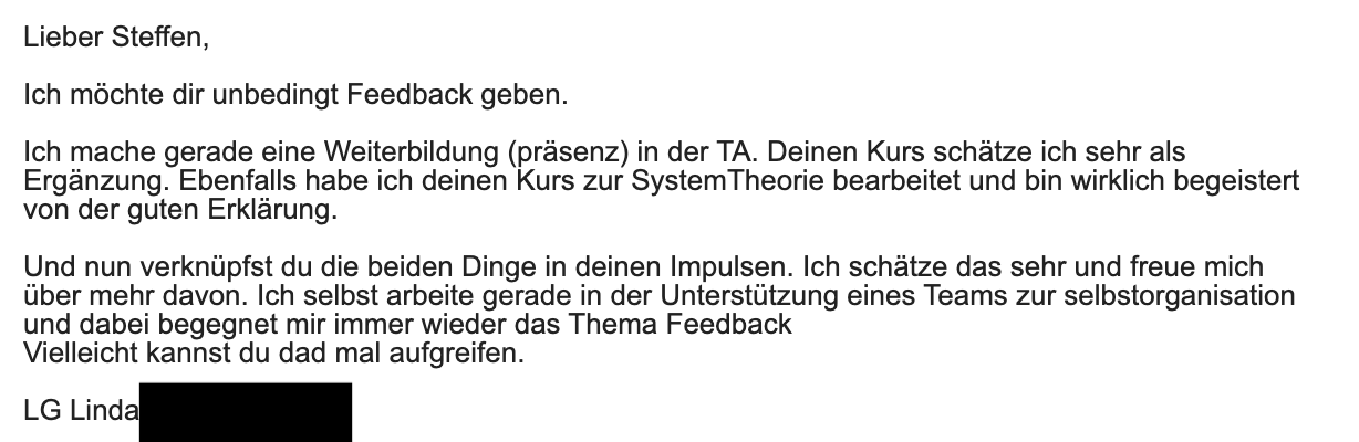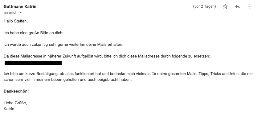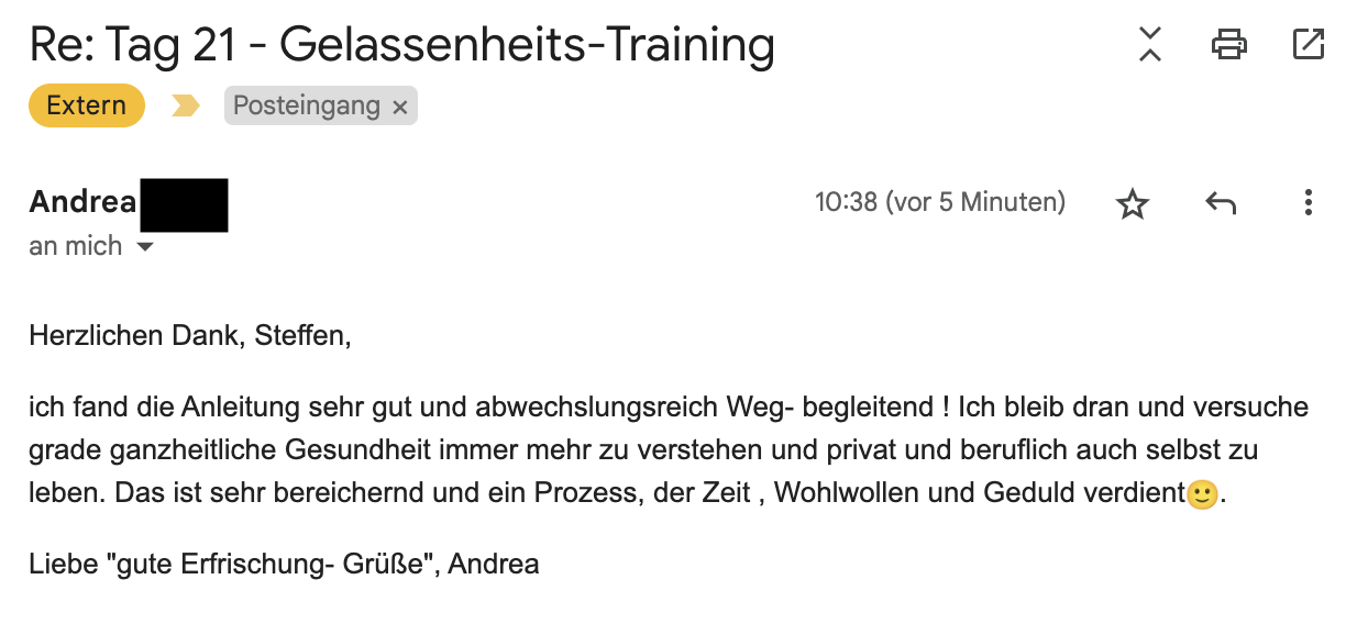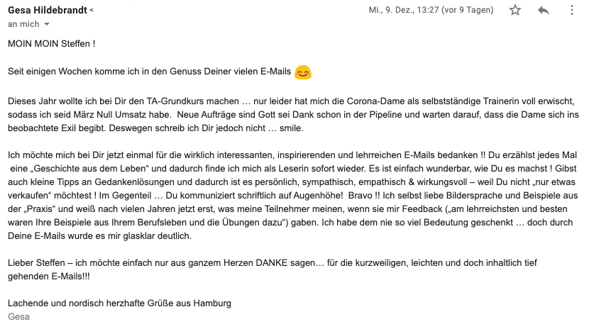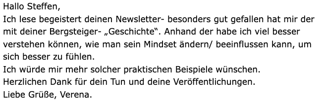 Lieber Steffen, deine Mails und die damit verbundenen Inputs lese ich jedes mal voller Begeisterung und sie sind mir Inspiration und steigern mein Bewusstsein… Ich könnte dir noch so viel mehr schreiben! Ganz herzlichen Gruss und vor allen Dingen, DANKE, dass Du deine Erfahrungen und Gedanken mit anderen Menschen teilst, Guido