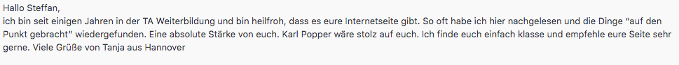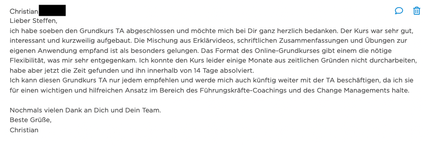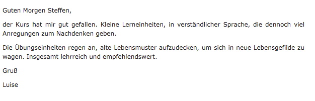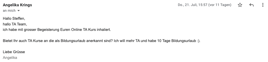 "Der Online-basierte Grundkurs TA war für mich ein effizienter und praktischer Einstieg in die TA. Die Module sind überschaubar, ansprechend konzepiert und präsentiert. Das zusätzliche Download-Material stellt eine gute Ergänzung dar. Die Teilnahme am Kurs hat mein Interesse an der TA verstärkt. Ich werde dranbleiben." Susanne B.