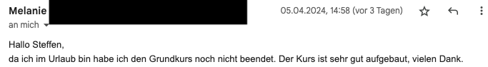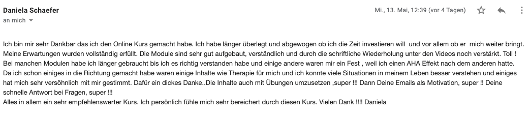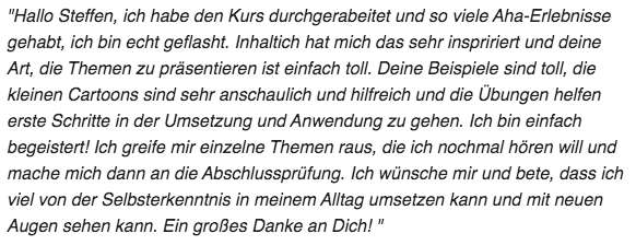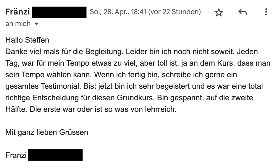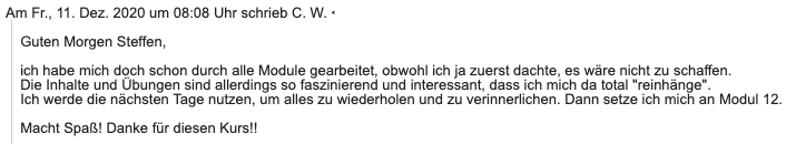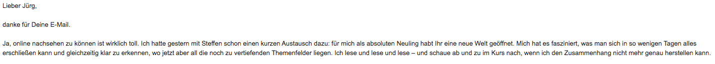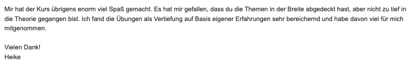 Den Kurs finde ich spitze! Ihr habt eine begeisterte Schülerin. Es ist für mich sehr bequem in dieser Weise. Ich bin schon so ständig in Weiterbildungsseminaren. Die Module sind sehr verständlich und die dazugehörigen Blätter eine große Hilfe. Ich habe große Freude daran. Ich habe bereits Werbung gemacht in meinen Kreisen und hoffe, dass es dann auch genutzt wird. Vielen Dank für diese tolle Möglichkeit. Falls Ihr je weiterführende Seminare online zur Verfügung stellt, ich wäre dabei.