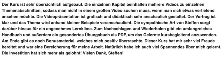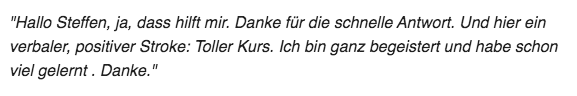 Lieber Steffen, danke für deine ausführlichen, sehr anschaulichen und super erklärten Module! Mittlerweile bin ich ein richtiger Fan von TA, dabei halte ich eigentlich nur ein Referat für meinen Pädagogikkurs (alles angehende Lehrer).