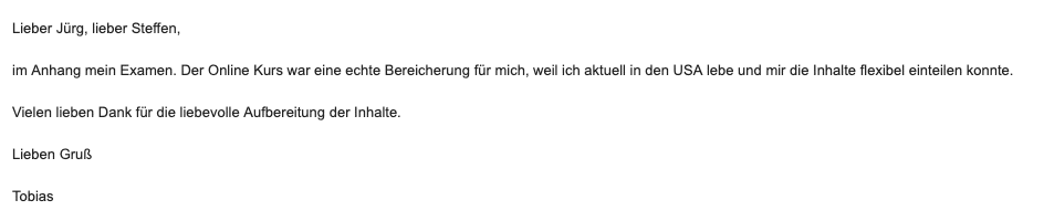 Über eine Internetrecherche wurde ich auf diesen Einsteiger-Internet-Kurs aufmerksam. Da ich schon beruflich unter der Woche viel unterwegs bin, sind mir meine Wochenenden heilig. Daher kam mir dieser Kurs sehr gelegen, weil ich selbst bestimmen konnte, wann ich mich den verschiedenen Themenbereichen der TA stellen will bzw. wann ich den Kurs dann letztendlich abschließen will. Aus diesem Grund kann ich diesen Kurs nach besten Wissen und Gewissen empfehlen. Er hat all meine Fragen zur TA beantwortet und der Support war weit über das übliche Maß vorhanden. Ebenso genial und nicht selbstverständlich war die von Steffen geleistete Prüfungsvorbereitung von Modul zu Modul. Von mir 5 von 5 Sternen für diesen Online-Kurs.