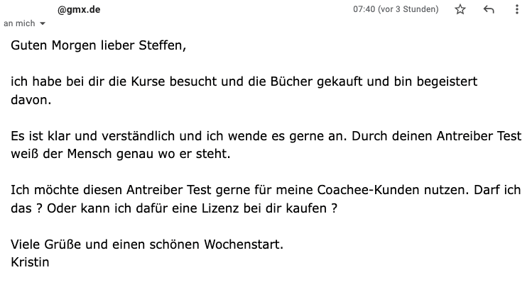 „Wir haben die TA-Online-Kurse sehr erfolgreich zur Verbesserung der Kommunikation in unserem Team genutzt. Die Ergebnisse wurden ab der ersten Woche sichtbar und haben zu einem deutlich besseren Arbeitsklima geführt. Wir setzen durch die positiven Erfahrungen bis heute auf die Expertise von Steffen Raebricht und seinem Team.“