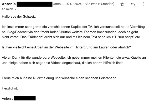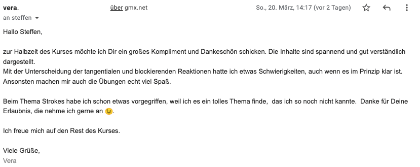 Die Einwahl in den TA-Grundkurs klappte auch bestens und ich bin, mal ganz abgesehen vom Inhalt der TA - begeistert, wie akribisch und völlig durchorganisiert Du diesen Online-Kurs geplant und angelegt hast. Da ist aber auch gar nichts dem Zufall/Suchen/ Ausprobieren im Sinne von 'Versuch und Irrtum' überlassen.