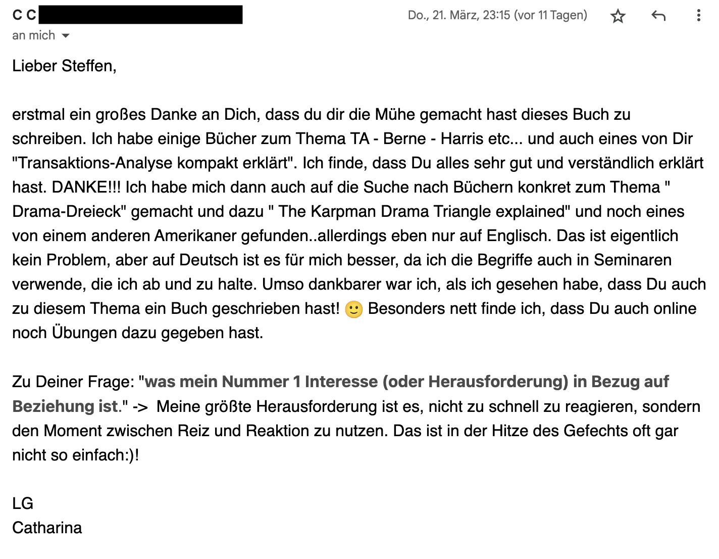 Ich finde, du hast das Buch sehr gut geschrieben. Wenn ich an meine Psychologievorlesungen denke, war das trockene Theorie. Du schaffst es die Theorie lebendig zu erläutern. Das macht es verständlich und leicht zu lesen. Mein Leseverhalten beschränkt sich grundsätzlich auf meinen Urlaub. Bei deinem Buch habe ich gern mal eine Ausnahme gemacht. Ich werde es sogar nochmal im Urlaub kommende Woche lesen. Es ist wirklich interessant, wieviele 'Drama-Situationen' mir schon beim ersten Mal bewusst geworden sind. Und ich bin gespannt,welche Gedanken mir noch so kommen.